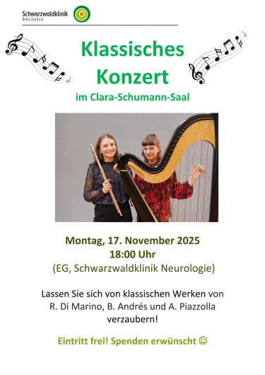 In unserem Clara-Schumann-Saal der Schwarzwaldklinik Neurologie spielen sie für unsere Patienten und Mitarbeiter um 18 Uhr ein tolles klassisches Konzert. Sie sind ebenso herzlich eingeladen!